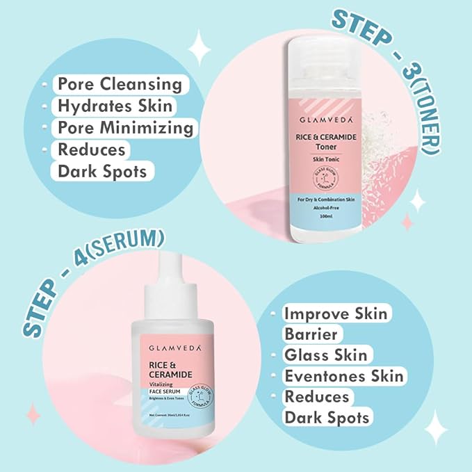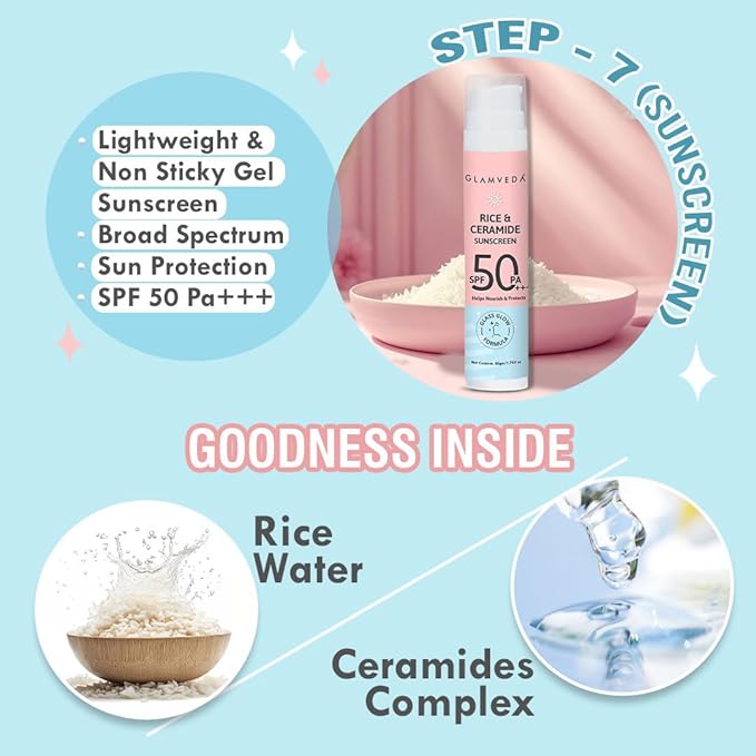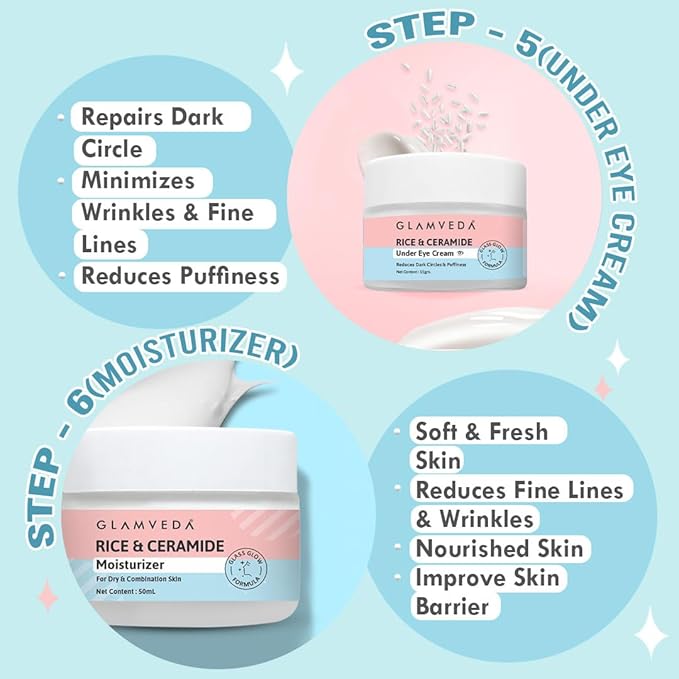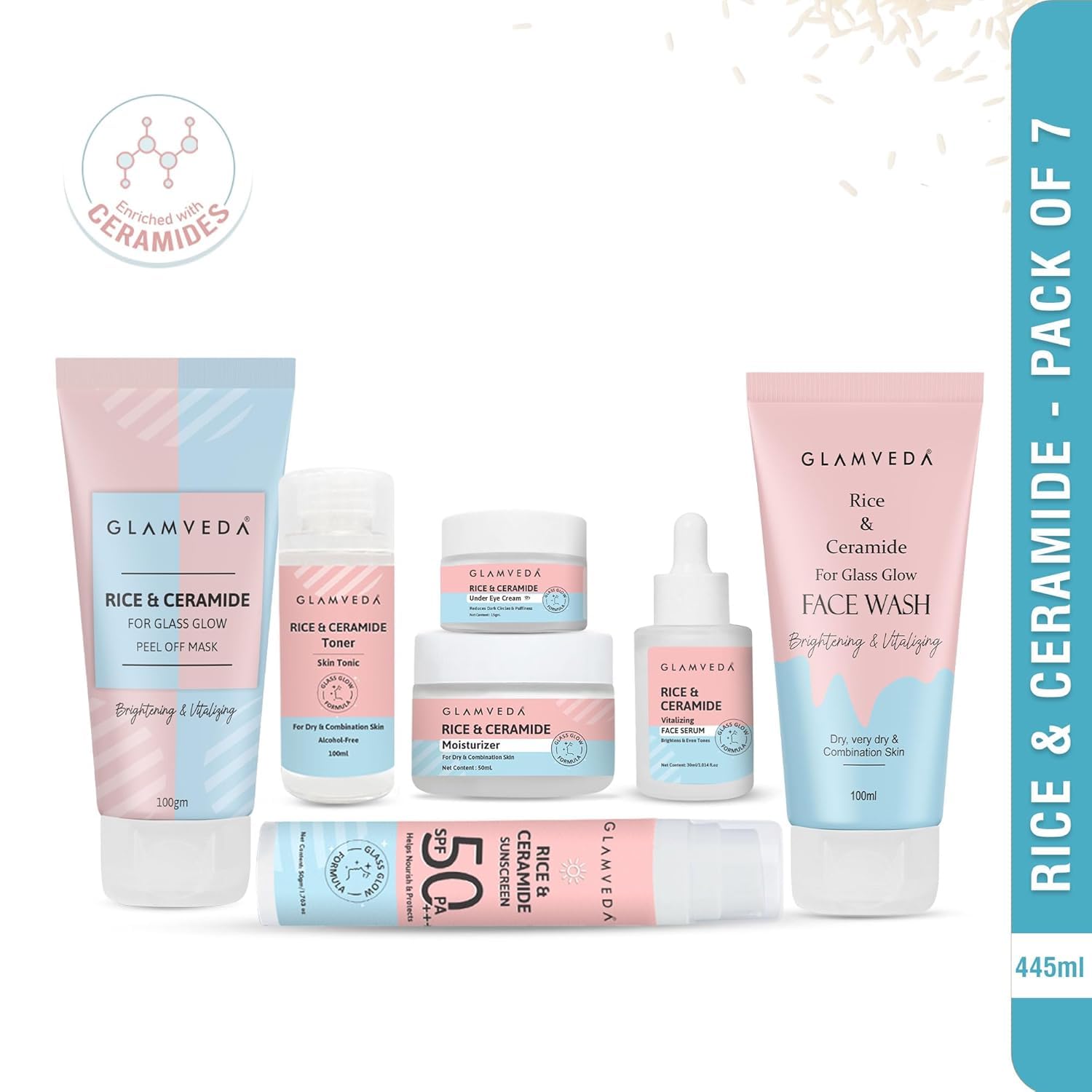 Glamveda Korean Rice & Ceramide 7 Step Weekly Skincare Routine For Women with Gift Box | Face wash, Peel Off Mask, Toner, Serum, Under eye cream, Moisturizer & Sunscreen | Skin BrighteningGlamveda Korean Rice & Ceramide 7 Step Weekly Skincare Routine For Women with Gift Box | Face wash, Peel Off Mask, Toner, Serum, Under eye cream, Moisturizer & Sunscreen | Skin Brightening