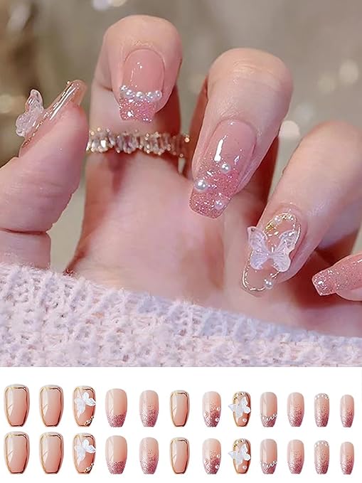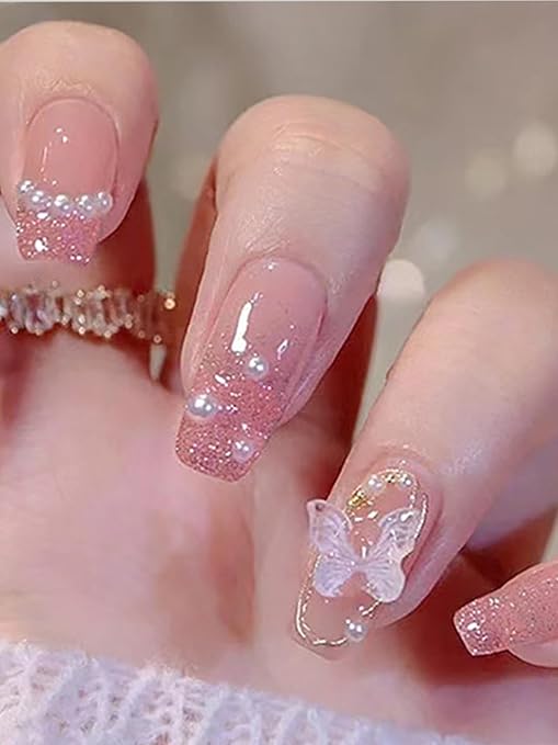 Secret Lives® acrylic translucent press on nails artifical designer 3D white bow & pearl with pink glitter color nails extension 24 pieces combo set with kit beautiful fake false nails