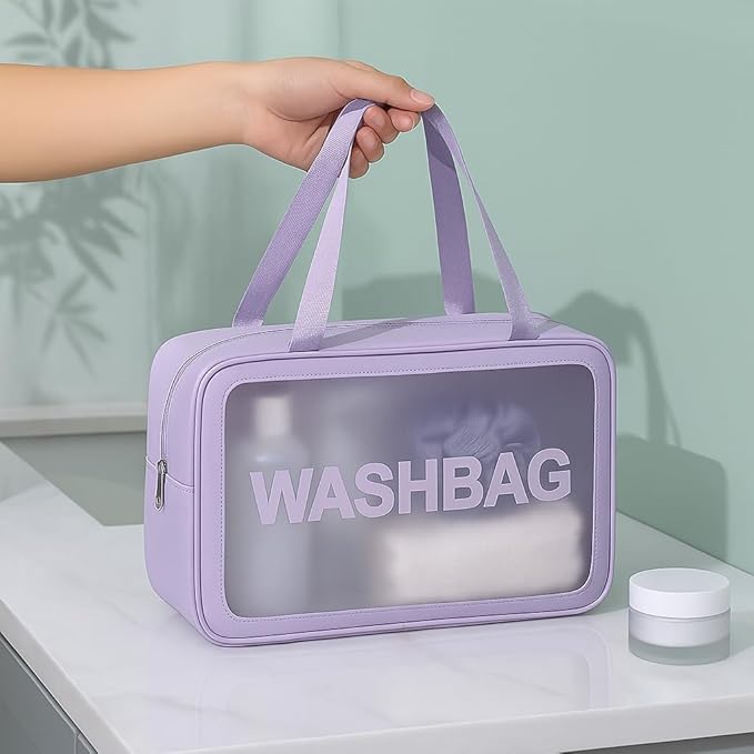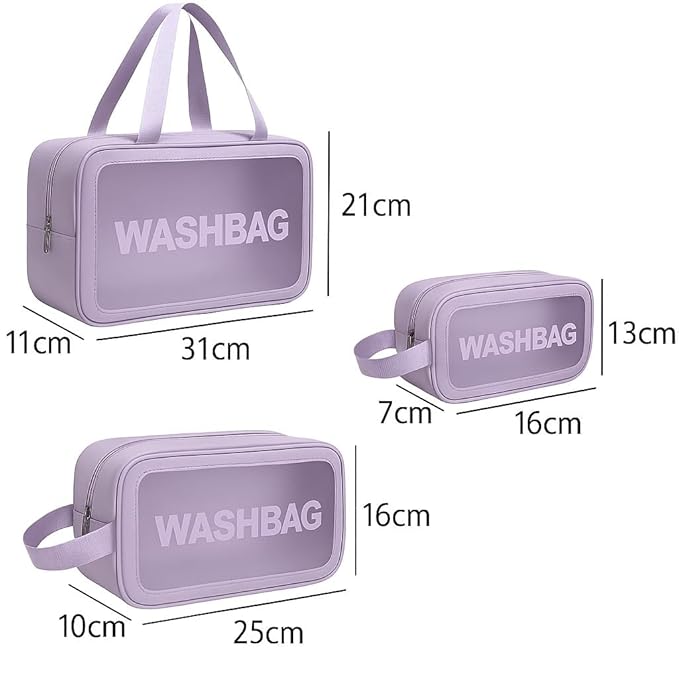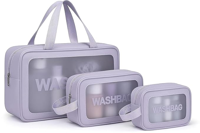 Wash Bag Cosmetic Case Set of 3, Clear Travel Wash Bags with Handles, Water-Repellent Bags, Transparent Wash Bags (Purple)